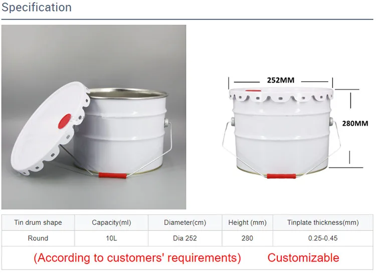 Customized Logo wholesale 10 Liter Tinplate Paint Metal Bucket with Plastic Spout Cap