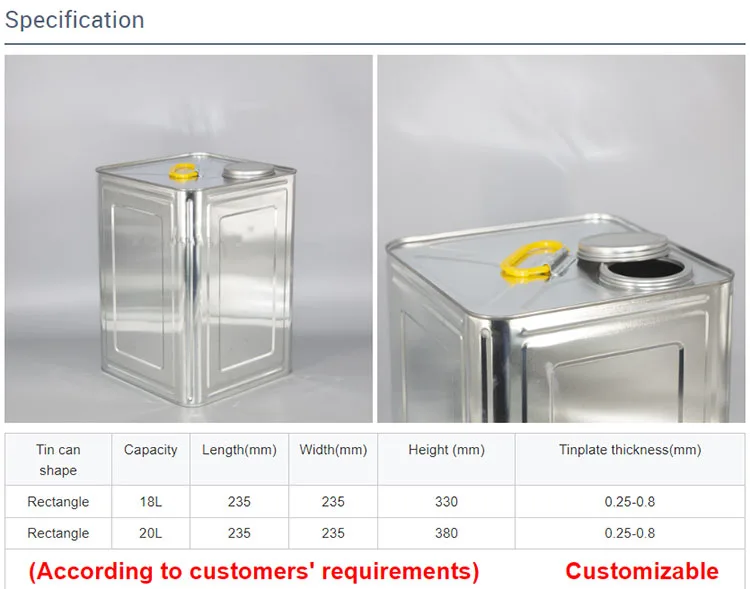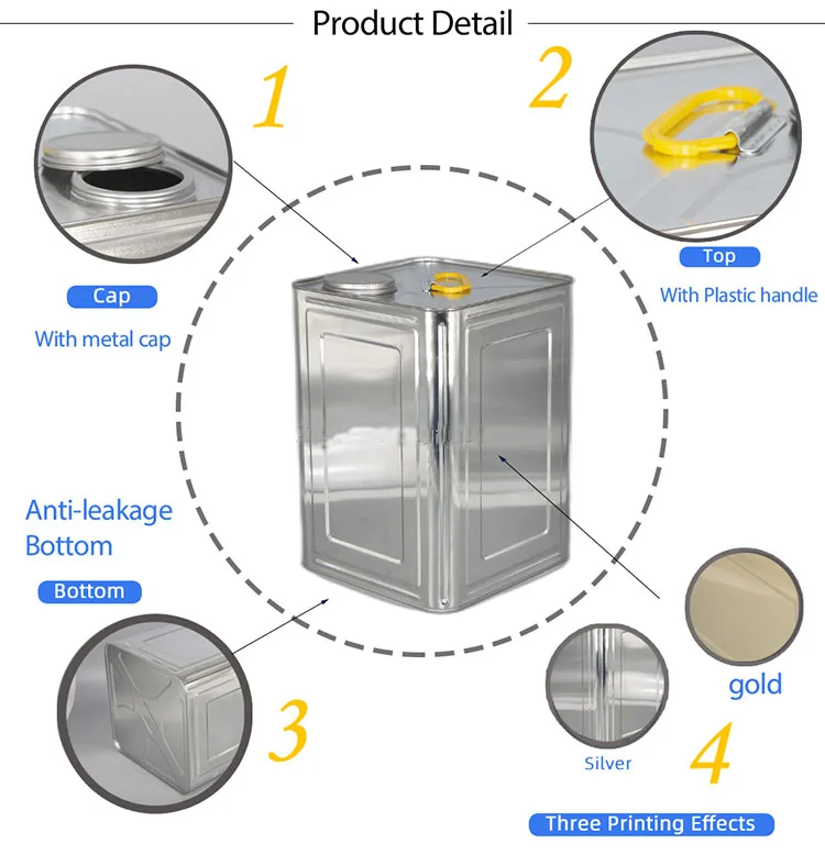 Factory price empty tin can with metal lid and plastic handle printed 18L square shape tin can